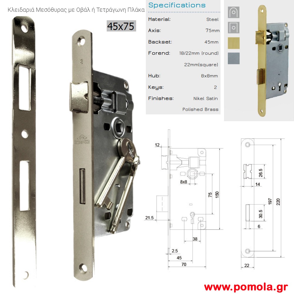 108 Κλειδαρια εσωτερικης πορτας 45χ75 τετραγωνη 24x3 gv