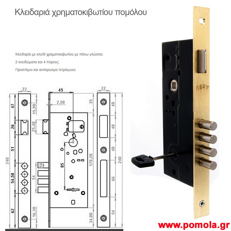 Κωδικός: 00133444045 Κλειδαρια ασφαλειας με 4 πυρους και 2 κλειδωματα με κλειδι χρηματοκιβωτιου gv