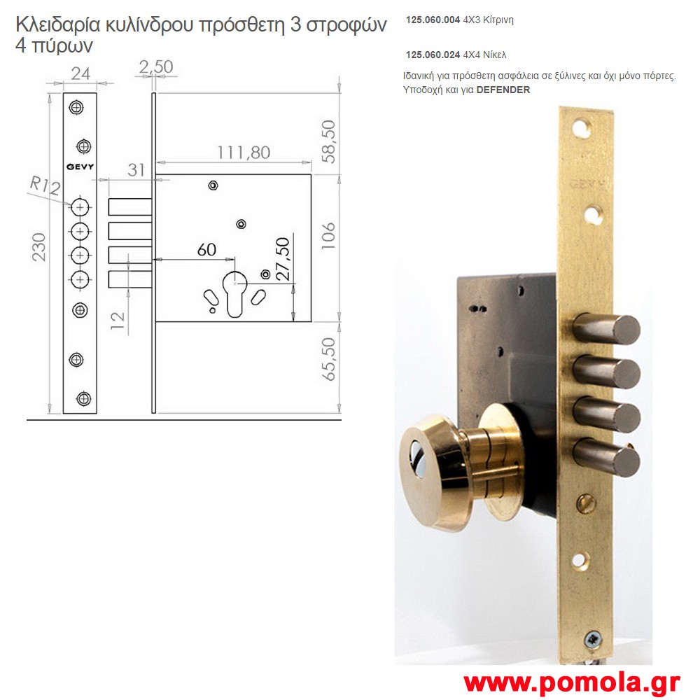 Κωδικός: 00133450051 Κλειδαρια ασφαλειας προσθετη με 4 πυρους και 3 κλειδωματα με κυλινδρο gv