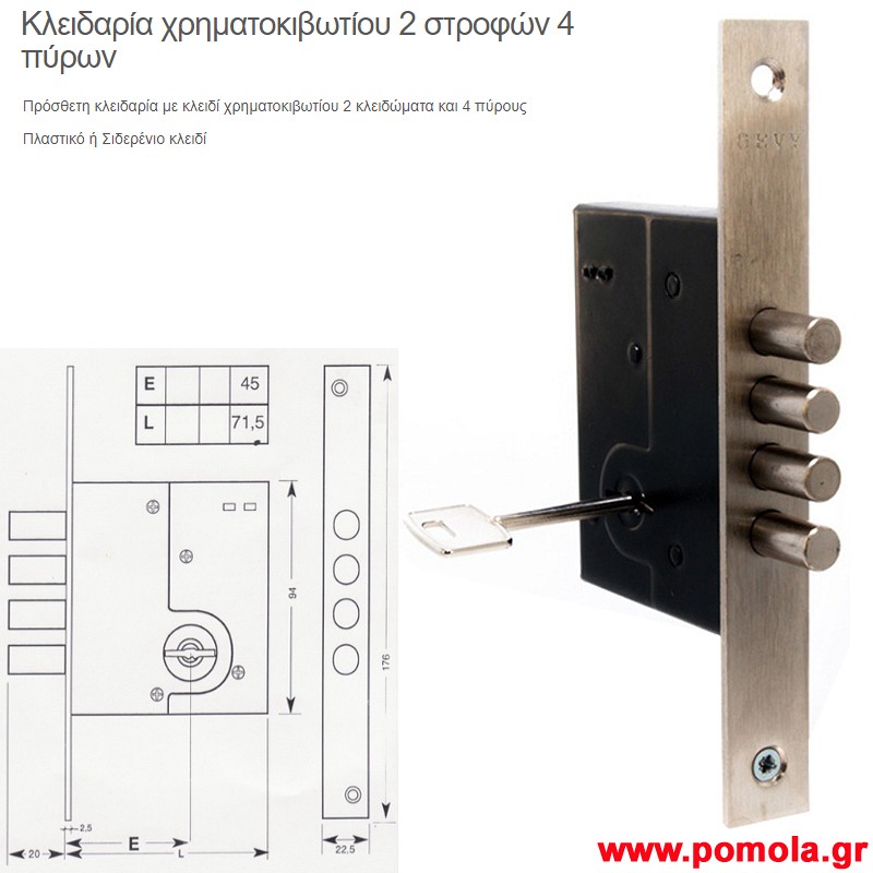 Κωδικός: 00133452053 Κλειδαρια ασφαλειας προσθετη με 4 πυρους και 2 κλειδωματα με κλειδι χρηματοκιβωτιου gv