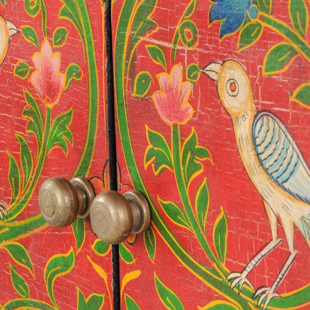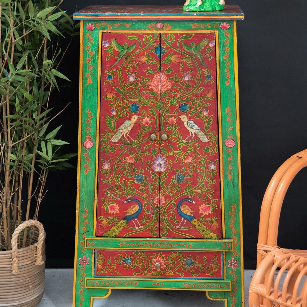 Φτιάχνεται από ξύλο μάνγκο και είναι ζωγραφισμένο στο χέρι. Εξωτικά πουλιά και παγώνια σε έναν υπέροχο κήπο ενός παλατιού της Κίνας. Υπέροχο έπιπλο για να τοποθετήσετε σε έναν τοίχο βαμμένο με ένα σκούρο γκρι ή κυπαρισσί, συνδυασμένο με έναν περίτεχνο καθρέπτη και να δημιουργήσετε ένα μαγικό σκηνικό. Χειροποίητο. Προϊόν δίκαιου εμπορίου. Διάσταση: 50x35x91εκ.