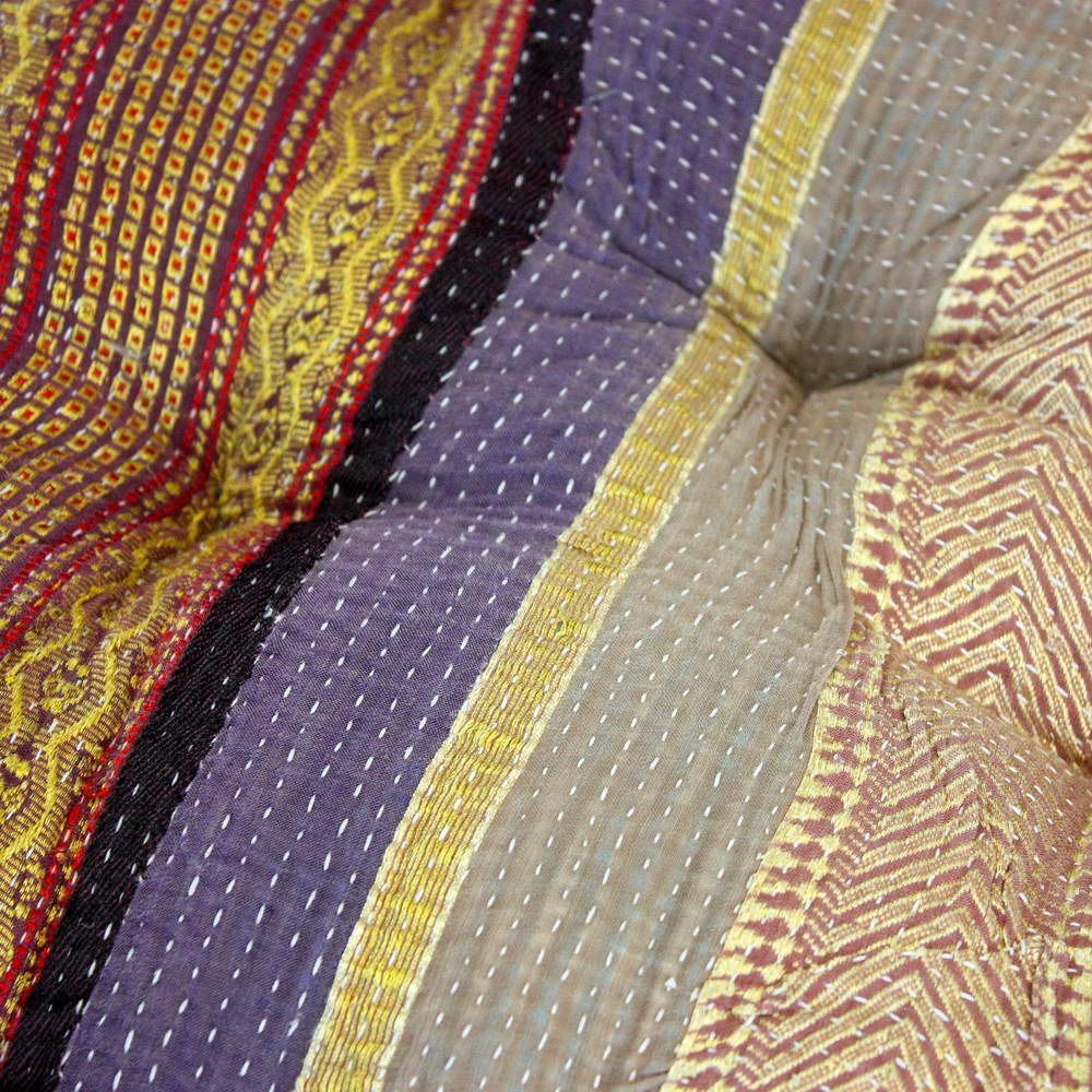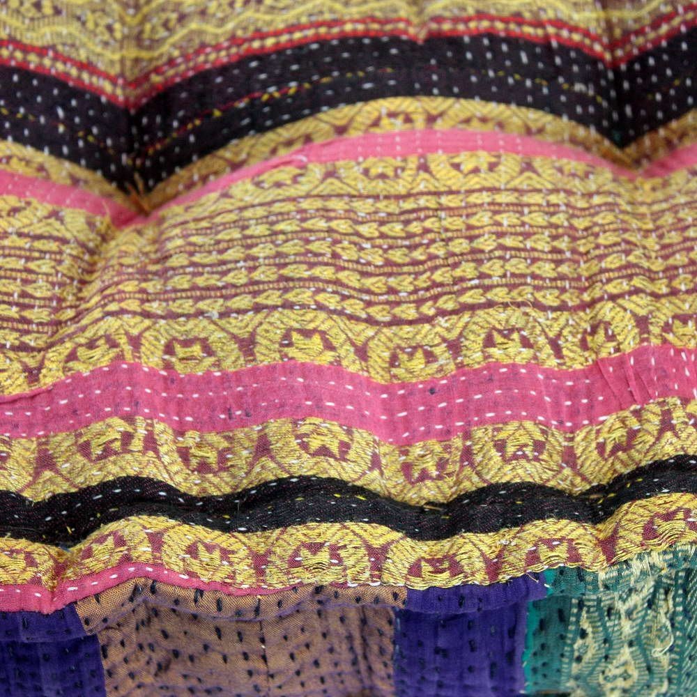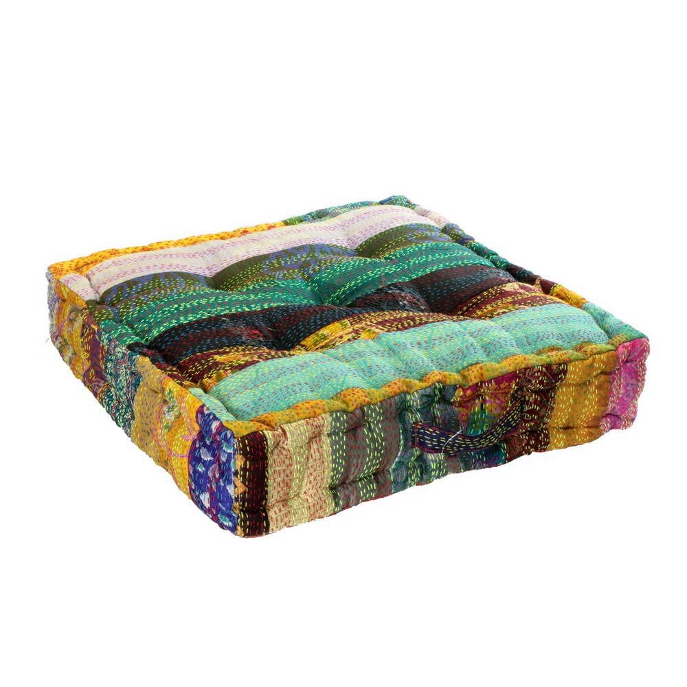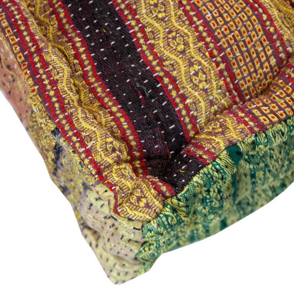 Μαξιλάρα δαπέδου με επένδυση από μεταξωτά υφάσματα. Όλη η επιφάνεια είναι κεντημένη με την τεχνική Kantha. Ζωντανά χρώματα και υπέροχες υφές σε συνδυασμούς που τραβάνε την προσοχή και προσκαλούν να τα χρησιμοποιήσεις. Το γέμισμα είναι πολύ αναπαυτικό και ανθεκτικό. Βάλτε τα σε πεζούλια ή στο δάπεδο, μόνα τους ή συνδυασμένα μεταξύ τους. Όπως και να τα βάλετε θα δείχνουν καταπληκτικά! Διάσταση: περίπου 43-45εκ. Υ.10εκ.