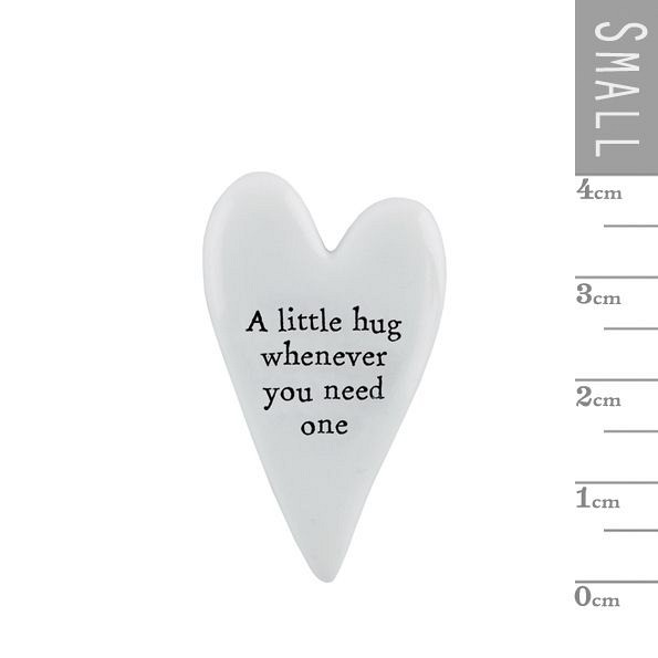 Μίνι καρδιά από λευκή πορσελάνη και εγχάρακτο μήνυμα. Θα τις βρείτε σε διάφορες εκδοχές για να διαλέξετε. • Υλικό: Πορσελάνη • Μήνυμα: A little hug whenever you need one • Διάσταση: 2,4x0,3x4 εκ. • Προέλευση: Αγγλία