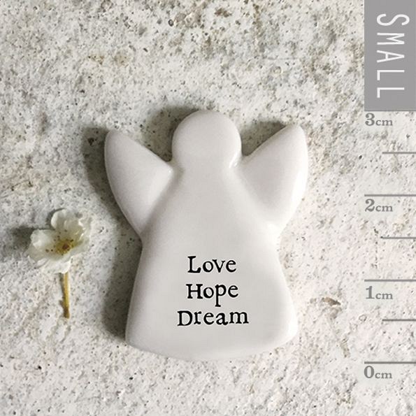 Μικρός άγγελος από λευκή πορσελάνη και εγχάρακτο μήνυμα: Love, hope, dream • Προέλευση: Αγγλία • Εταιρία: East of India • Υλικό: Πορσελάνη • Διάσταση: 3x0,3x2,5 εκ.