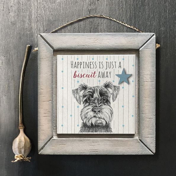 Ένα πολύ όμορφο ξύλινο καδράκι με το σχέδιο ενός χαριτωμένου μαλλιαρού σκύλου. Το μήνυμα είναι ένα λογοπαίγνιο : “Happiness is just a biscuit away” • Κατασκευαστής: East of India U.K. • Υλικό: Ξύλο • Διάσταση: 10x10x1.5 εκ.