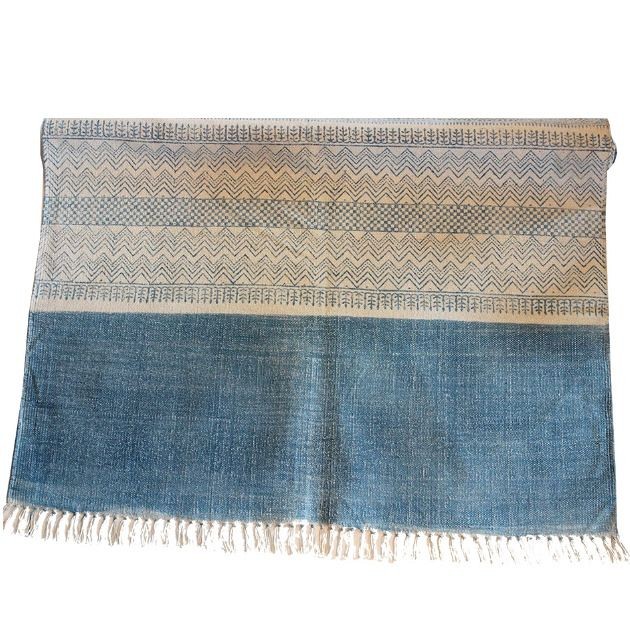 Βαμβακερό χαλί σε τζιν με γεωμετρικά σχέδια και τελείωμα με κρόσσια. Πολύ όμορφο απαλό και νεανικό χαλί, Φροντίδα: πλύσιμο στους 30 βαθμούς Διάσταση: 120x180 εκ.
