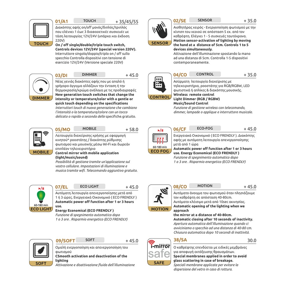 Προσφέρουμε τη δυνατότητα κατασκευής προσαρμοσμένων καθρεπτών, είτε απλών είτε σύνθετων, εξοπλισμένων με οποιαδήποτε ηλεκτρονική ευκολία επιθυμείτε, πάντα με τεχνολογία αιχμής τελευταίας γενιάς.