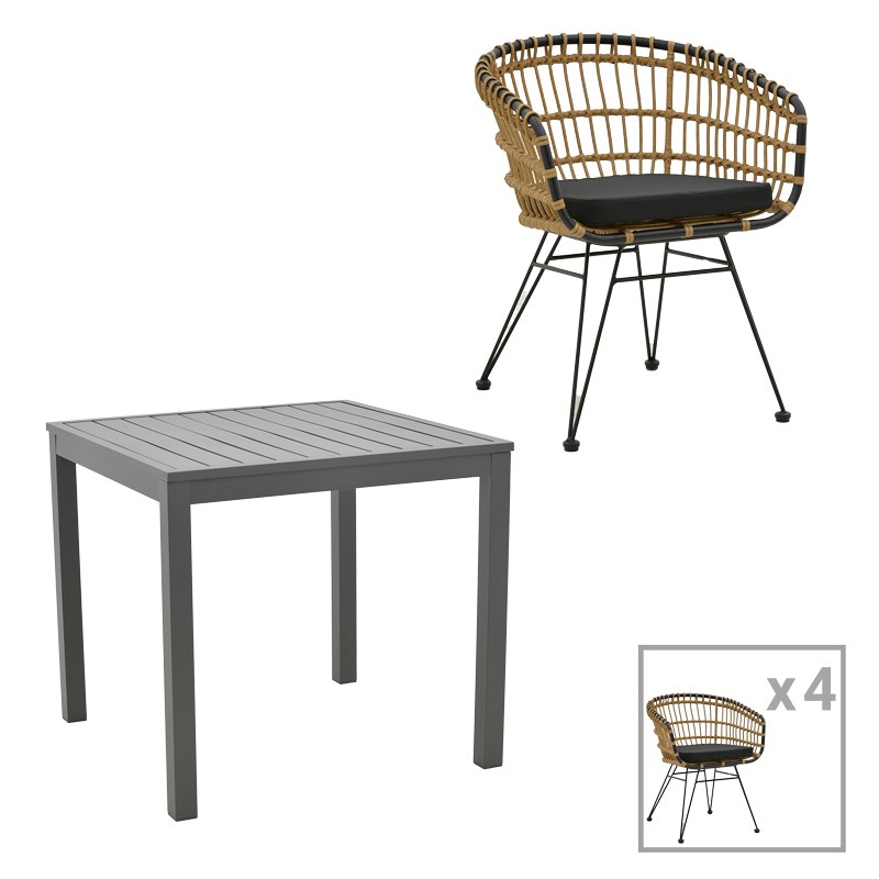 Τραπεζαρία Naoki V σετ 5τεμ pakoworld rattan pe σε φυσική απόχρωση και μαύρο μέταλλο 80x80x78εκ